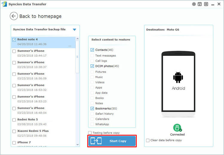 Syncios Data Transfer contains the function of Backup and Restore your Moto G6 in only one click operation. Just simply tap the 'Start Copy' button, Syncios will transfer all the selected contents.