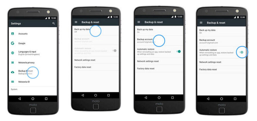 Step 3 Choose Backup & reset. Choose Back up my data, enable this option. Then you have enabled automatic backup on your Moto X4, your settings, app data, messages, photos will be periodically saved remotely.