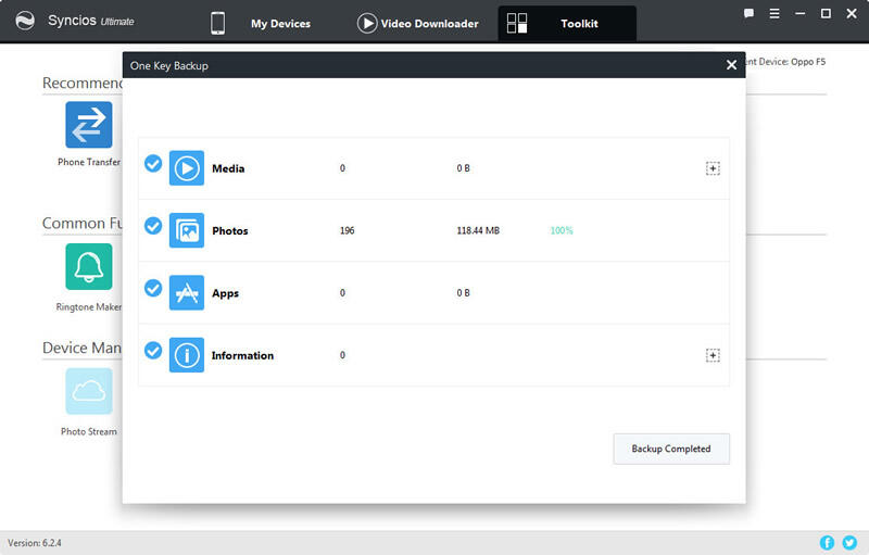 To start backing up and restoring your OPPO Find X8, you need to download and launch Syncios Manager on your computer. Then launch Syncios and connect OPPO Find X8 to computer via USB cable, wait Syncios to sync. If you encounter any detection problem during the process, just click here to fix. Then select 'Toolkit' module, you will see '1-Click Backup' and '1-Click Restore' function. These are the functions that we need in the following steps.