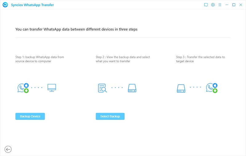 Start Syncios WhatsApp Transfer on your computer, Windows version or Mac version are available. From the start-up interface, choose "WhatsApp Transfer", open it after its downloading. Then choose Backup WhatsApp.