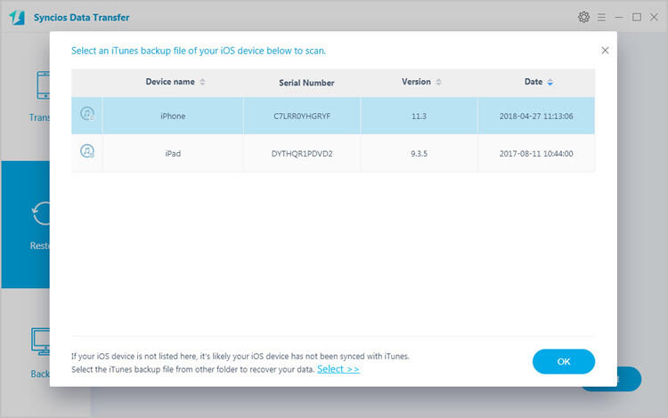 Select 'Syncios Backup' option and choose the certain backup you've made by Syncios before and click 'OK'. Then click on 'Next' button to select your willing content and start the transferring process.