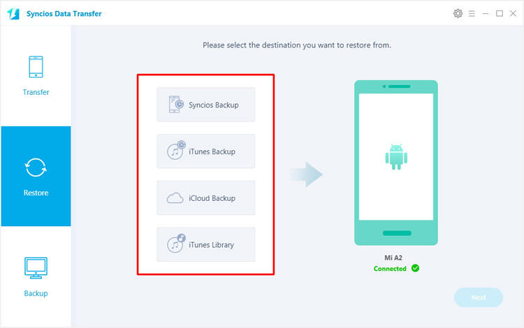 With the help of Syncios Data Transfer, you can restore data from iTunes and iCloud. As well as the backup you have made before. More detailed description is showing below. Let's have a look. Now launch Syncios Data Transfer and connect your Mi A2 to computer through UBS cable or by using Wi-Fi connection .Then choose 'Restore' module.