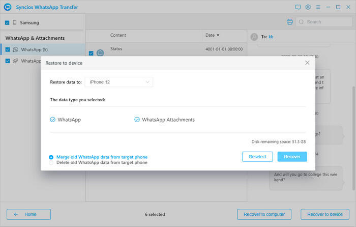 Step 7. Go ahead, tap to "Recover to device" >> "Recover" to send the backup files to the target phone.