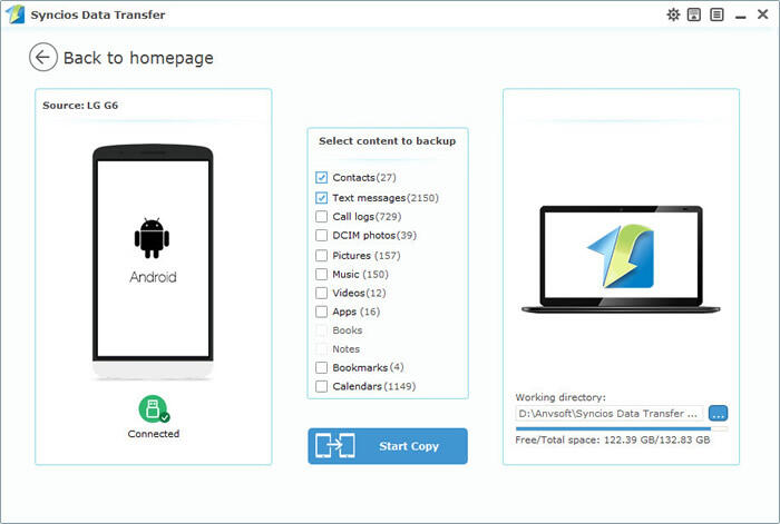 Choose 'Contacts' and 'Text messages' to transfer once Syncios has finished to synchronize your LG G6. Then click 'Start Copy' to launch the transferring process.
