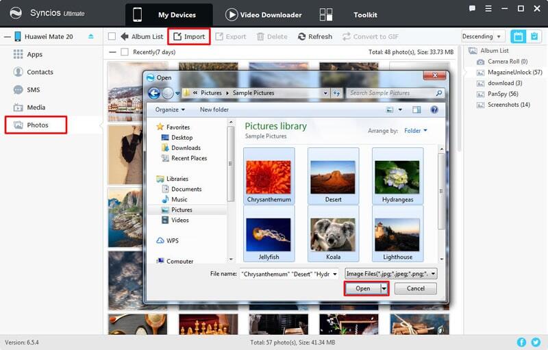 Choose 'Add File' and select your desired photo file(multiple contents are also available to be transferred). Finally, click 'Open' to import.