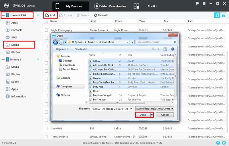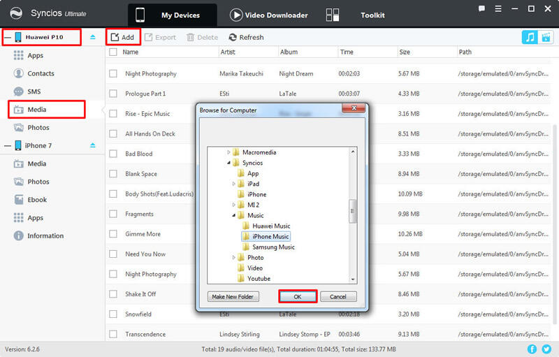 First, install and launch Syncios Manager. Then connect your iPhone 7 and Huawei Pura80 to computer via USB cable. If you encounter any detection problem during the process, please check our (Android / iOS detection problem). We now assume to export and import music. Once Syncios finished to synchronize your phones, choose 'Media' option on the left panel.