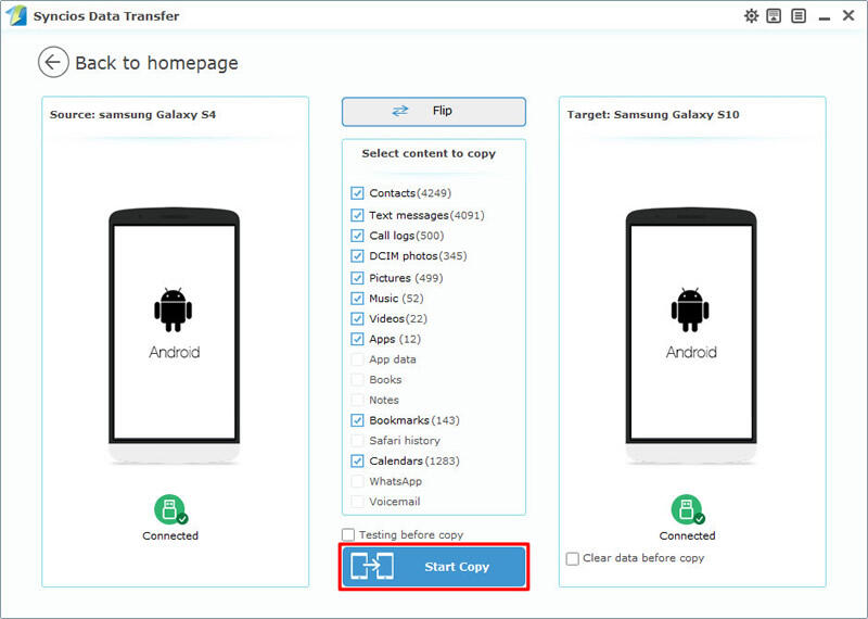 Then you can connect your Android/iOS device and your Samsung Galaxy S25 to computer. Please pay attention that your source device must on the left side while your Samsung Galaxy S25 must on the right. If you want to change their positions, click on 'Flip' to switch. Then you can choose the contents to transfer, you can change your saving path if you want and click 'Start Copy' to launch. Attention: Transferrable contents will be some difference due to different operation system.