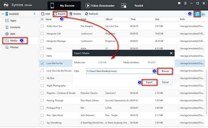 For those seeking to use a professional and intuitive solution for phone file backup and transfer, Syncios Data Transfer is the method for you. It is a professional tool for data backup and restore which could be used to sync all pictures and music to computer with few steps. It provides "Transfer", "Backup", "Restore" three different modes. Therefore, when you need to move thousands of photos and songs from a Huawei Pura80 to a SD card, you need this tool.