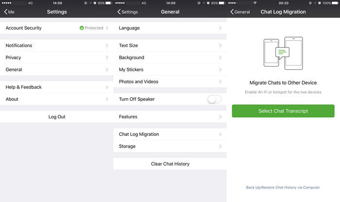 2. For iOS device, tap Me > Settings > General > Chat Log Migration.