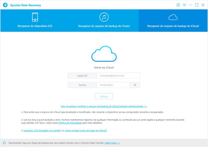 As etapas do arquivo de backup de varredura do iCloud são semelhantes às cópias de segurança do iTunes. O Syncios Data Recovery permite que você baixe e extraia seu conteúdo de backup do iCloud, para que você possa obter o que deseja dele, um a um.
