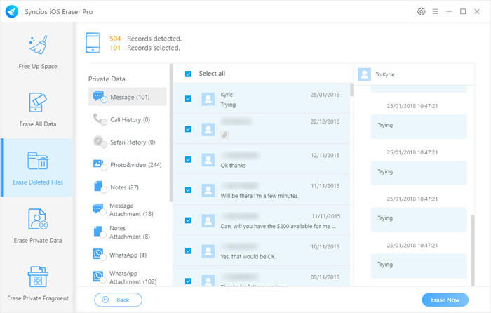 Messages, WhatsApp, Contacts, Notes, Safari History all these could be your personal information. And these stuff becomes extraordinarily important when you sell your phone to other people. So you should thoroughly clear them. Selectively kick on the checkbox under the Deleted Data category and the hit on Erase now to destroy these data, let no chance for invader to reuse.