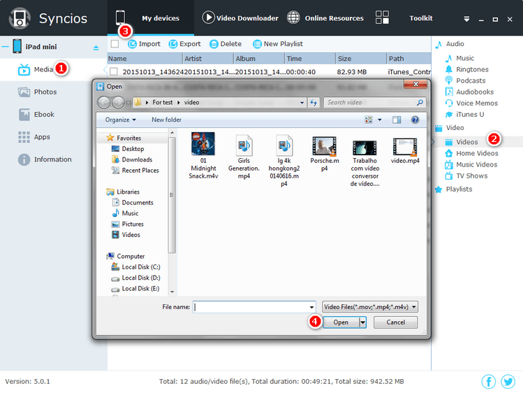 Step Four: Click on My Device button on the top of the toolbar of Syncios iPad Mini Converter. On the left column, unfold Media tab, highlight Videos on the right panel, click Import option, please browse the converted video file from your computer, then you can transfer the converted videos to iPad Mini.