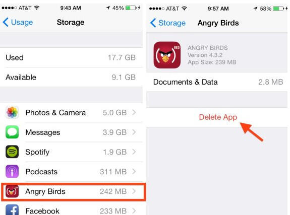 Undoubtedly, applications makes up the largest percentage of phone memory. To remove some useless apps on your iDevice could release considerable internal storage. Navigate to your iPhone, iPad or iPod Touch, tag on "Setting" > "General"> "Usage"> "Manage Storage". Tap an app to view details. Each app in the list will display how much storage space it is taking. You can tap "Delete App" to uninstall the app.