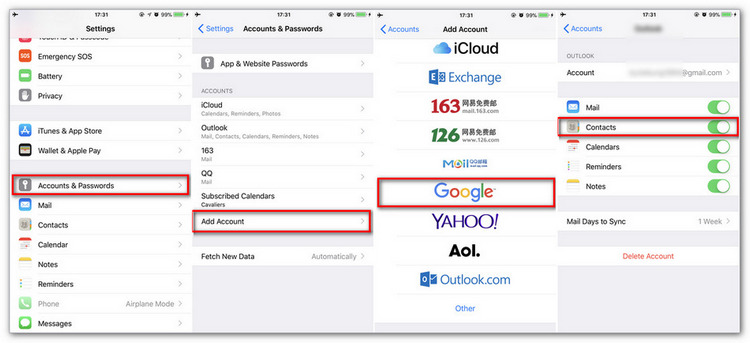 Step 2Navigate to your new iPhone X, open Settings > Accounts & Passwords > Add Account . Select Google to sign in your Google account, and after that, enable Contacts option. Before long, all of your Android contacts would be synced on iPhone 16.